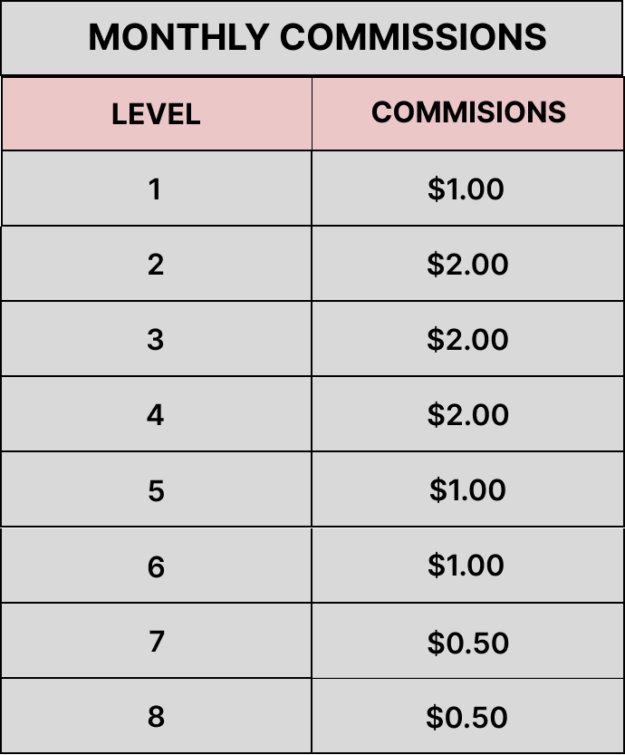 Here is a breakdown of the monthly commissions you can earn on each level: